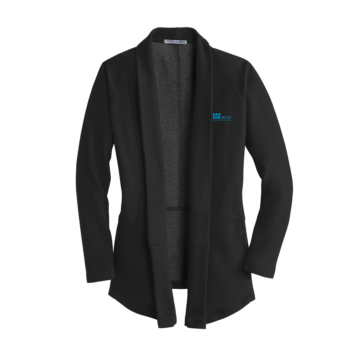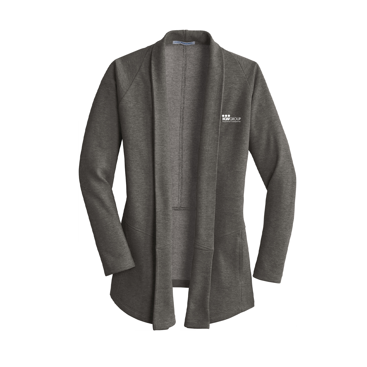 Shawl collar. This lightweight, dual-color cardigan layers beautifully and has a timeless appeal. An open front and front and back seaming details at the waist give it sophistication. 7.5-ounce, 60/40 cotton/poly. Side seam pockets. Raglan sleeves.
